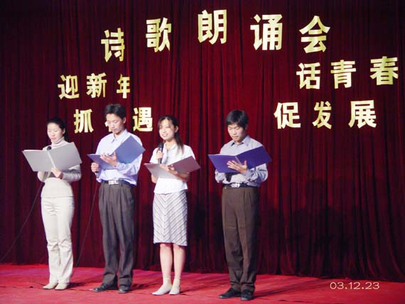 2003年12月23日下午2:30在大学生活动中心举办《迎新年、话青春、抓机遇、促发展》诗歌朗诵会,本次活动是由院工会主办、环艺系承办、教务处协办的。