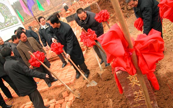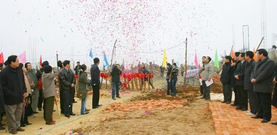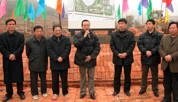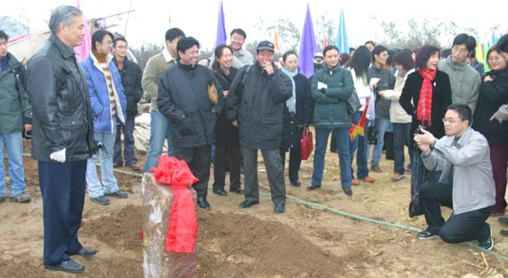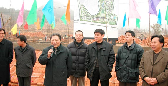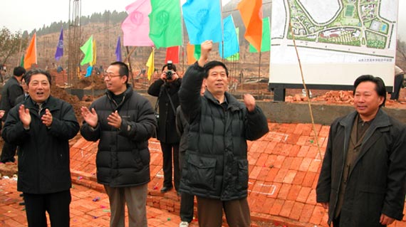 奠基纪念活动在庄严的国歌声中开始。三十响礼炮隆隆作响,象征着学校三十年的发展,同时也预祝第一次党代会的圆满成功!来自学院8个系的学生代表用各系的彩旗为金树披挂上五彩斑斓的旗帜,寓意“十年树木、百年树人”。接下来,参加奠基纪念活动的全体师生参观了新校区的规划设计方案。从千佛山麓来到北大山下,学院未来的宏图画卷将在这里展现。来宾、领导、党代会代表、学生代表分别为新校区奠基基石培土。此时,师生合唱《团结就是力量》,嘹亮的歌声震撼山谷,团结的力量将写就千秋伟业。最后,党代表64人、特邀列席代表21人,新校区工作人员16人将刻有本人签名的101块耐火砖组成“开工大典”四个字,寓意为新校区建设添砖加瓦。