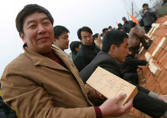 ↑党代表们把刻有自己签名的钢砖拼出“开工大典”四个大字,表示要为学院建设添砖加瓦。