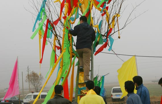 ↑学生代表用各系的彩旗为金树披挂上五彩斑斓的旗帜,寓意“十年树木、百年树人”。