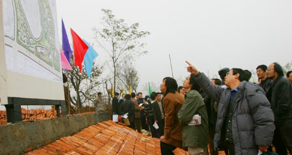 ↑参加奠基纪念活动的全体师生参观新校区的规划设计方案。