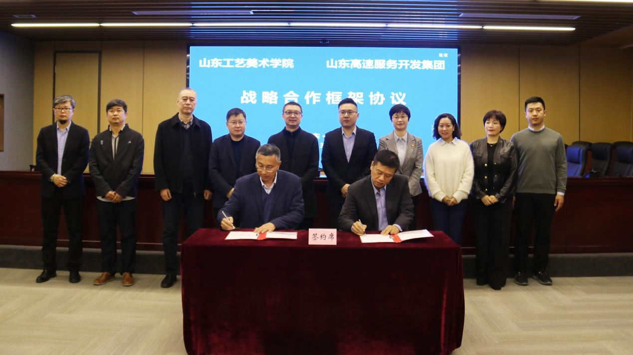 学校服务山东省文化创意产业发展管理委员会、社会服务办公室,山东省文化创意产业和智能制造创新创业共同体CEO团队,山东高速服务开发集团有限公司相关人员参加签约活动。
