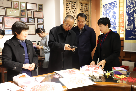 随后,潘鲁生一行来到郓城水浒好汉城,走进菏泽市非遗传承人杨秀玲剪纸工作室,观看第十五届中国民间文艺山花奖作品《黄河情》、剪纸《二十四节气》等作品,并对最新创作的剪纸书包等文创产品表现出浓厚的兴趣。最后在宋江武校校长樊庆斌的带领下,潘鲁生一行参观游览了水浒好汉城,在厚重的古典建筑间聆听郓城历史故事,感受水浒文化。