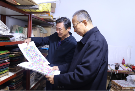 在郓城县华灵家苑小区,潘鲁生一行造访了县木版年画传承人张宪国,张宪国从事木版年画二十余年,其雕版被中国国家图书馆收藏,作品多次参加各级比赛并获奖,雕刻技艺受到行业内专家、教授的好评和认可。他们就木版年画雕刻技艺、传承创新等方面进行沟通交流,潘鲁生对郓城县木版年画的保护与传承工作给予肯定。