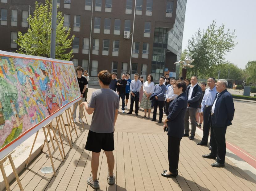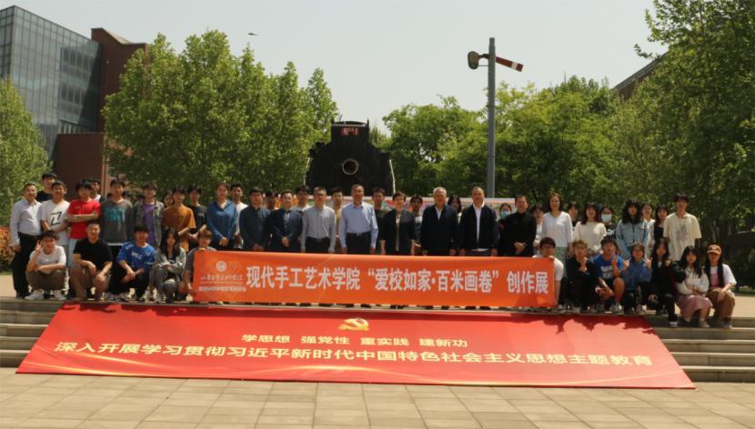 为深入学习宣传贯彻党的二十大精神,为建校五十周年献礼,4月19日,现代手工艺术学院“爱校如家 百米画卷”创作展在长清校区设计师广场举行。党委书记王晓娟现场观看展览并给予指导,纪委书记苗新民,副院长韩世春,党委委员、统战部部长孙大刚陪同观展。