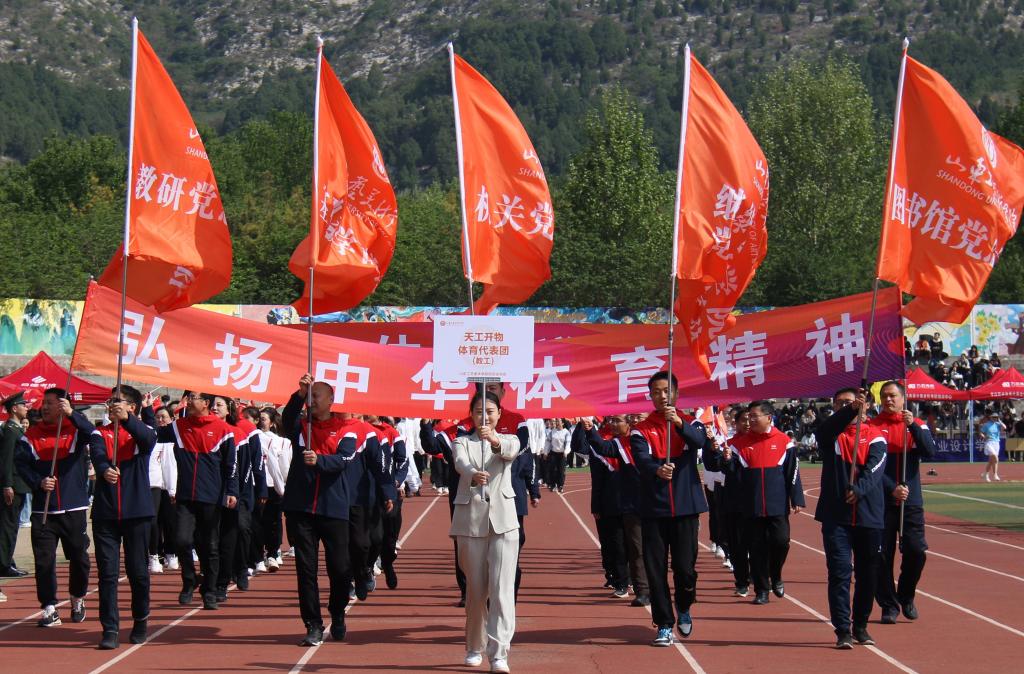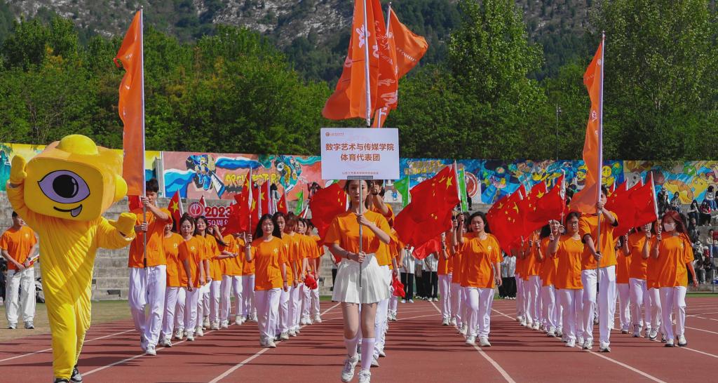 伴随着激昂的《运动员进行曲》,各学院代表队喊着嘹亮的口号,迈着统一整齐的步伐,在国旗护卫队的引领下依次入场,由学校教职工组建的“天工开物队”“匠心独运队”“三全育人队”“四有好老师队”4支队伍紧随其后。作为疫情之后的首届运动会,本届运动会围绕“深入开展学习贯彻习近平新时代中国特色社会主义思想主题教育”和“迎接建校50周年”两大主题,每支方阵各具特色,口号气势冲天,形式大放异彩,表演精妙绝伦,汇聚了啦啦操、甩旗舞、古典舞、蒙古舞等元素,为本届运动会注入青春与活力,尽显山工艺人的朝气与蓬勃。