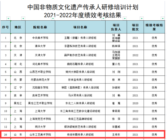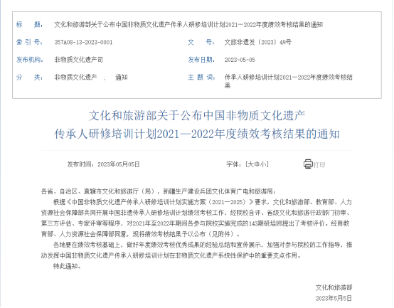本次绩效考核由文化和旅游部、教育部、人力资源社会保障部共同开展,从研培班的教学组织、教学管理、保障机制、教学效果及反馈评价五个方面进行考核。通过现场汇报、材料审核、专家答辩等方式,经院校自评、省文化和旅游厅初审、第三方评估、专家评审等程序,对全国2021年至2022年期间实施完成的非遗研培班进行全面考核评价,考核结果为优秀、合格、不合格三个等次。