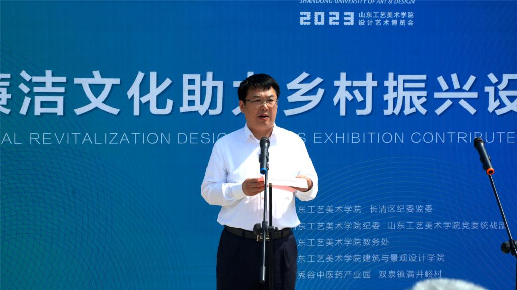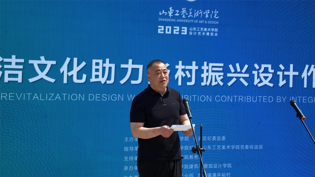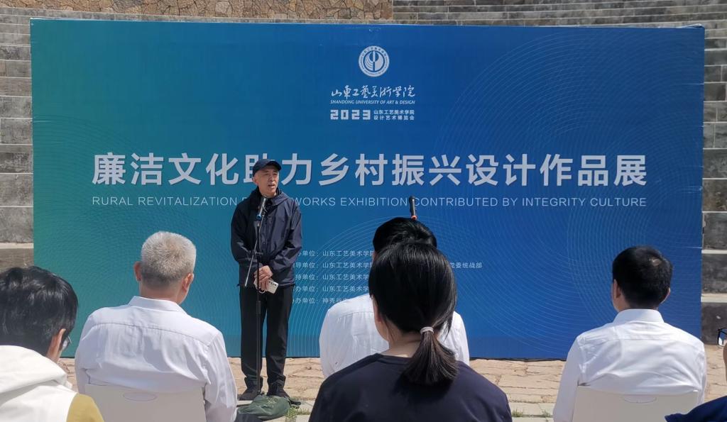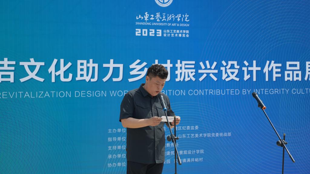孙大刚在致辞中表示,加强新时代廉洁文化建设,是党的事业的重要保障,以廉洁文化建设助力学校服务乡村振兴,是威尼斯7798cc党建引领业务工作的重要实践。建筑与景观设计学院、视觉传达设计学院多年来坚持为人民而设计的设计理念,以设计赋能乡村振兴,在教学、科研创作、社会服务等方面积极实践,本次展览集合规划、景观、园林、环境艺术等专业,协同视觉、公共艺术多专业交叉融合,同时联合党外专家学者,发挥专业优势,对设计服务乡村振兴进行了有益探索,形成了丰硕成果。此次活动是学校与驻地政府开展乡村振兴交流合作的成果展示,希望通过此次活动,激发更多的年轻朋友通过创意设计,积极参与文化赋能乡村振兴,重新激活乡村文脉,增强农村发展活力,培育乡村发展新动能,为打造乡村振兴齐鲁样板贡献智慧和力量。