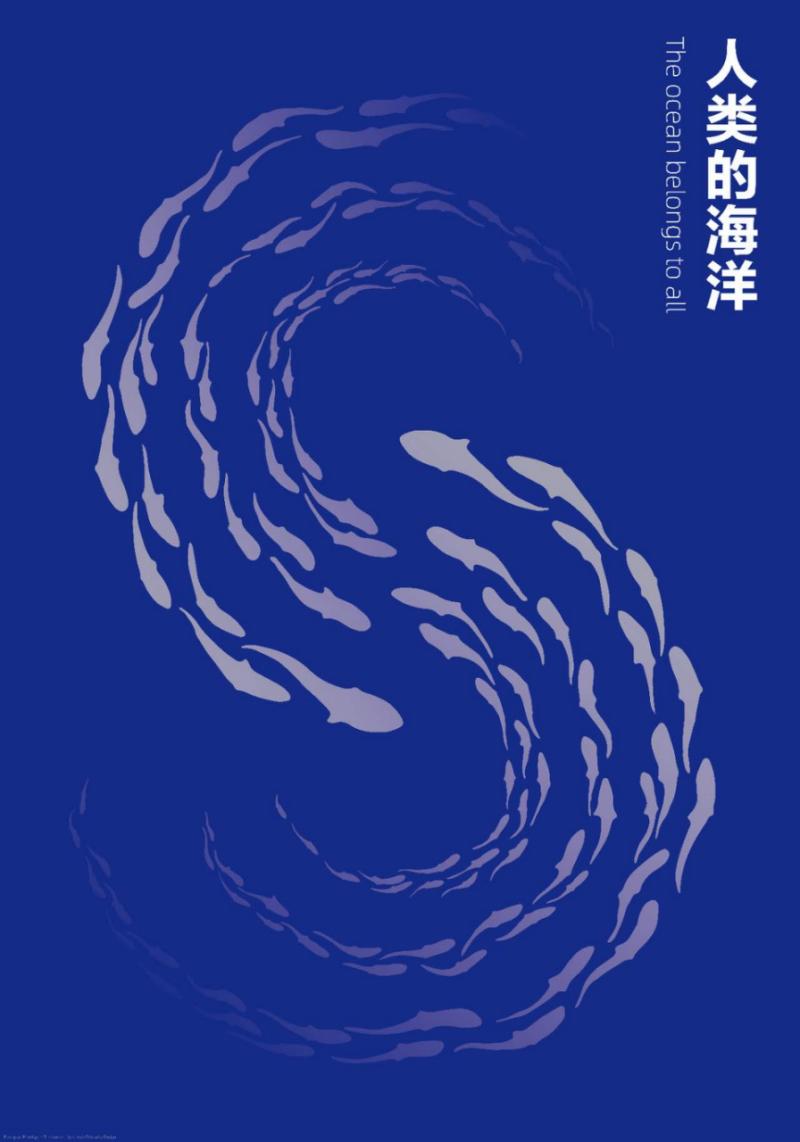 《人类的海洋》采用“S”形鱼群为基本骨架,鱼群错落交织游向海洋深处,寓意良好的海洋生态环境对鱼群等海洋生物稳定栖息的益处。造福于海洋,同时也是造福于人类。
