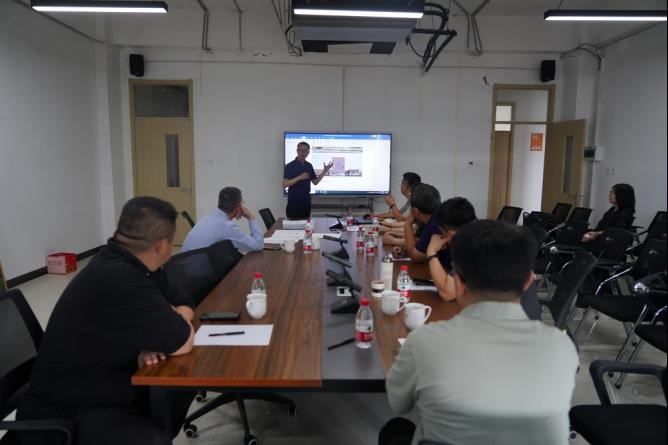 会谈前,韩世春一行到青岛基地过渡校区和一期项目现场进行了实地调研,通过专题会议与现场深入查看相结合的方式,详细了解、分析项目建设的细节与进度,汇总发现的问题。韩文涛对工作进展概况、一期项目启动仪式、系列展览、论坛安排,以及文化艺术中心、产教融合中心、国际交流中心的管理运营规划进行了说明。青岛基地相关负责人对产教融合、教学空间分配、设备采购规划、学生管理等工作进行汇报。与会人员围绕目前有关工作,以及楼体标识布局配色、宣传片制作等进行了讨论,对下一步的工作进行深入细致规划和具体安排。