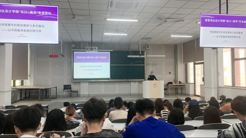 讲座分两个专题,分别由王颖惠、谭晓宁主讲。专题一以《可视化界面设计的美学观照》为题,围绕数字VR界面、空间造境维度、VR界面的沉浸式体验内涵、境界引动的美学观照与情境空间展开阐述。专题二则以《传统图案中的视觉载体与美学蕴涵》为题,围绕传统织绣技艺、以图记事—传统纹样、色彩审美观照、多元文化共生观进行释读。专题讲座系统全面地贴合视觉传达设计专业发展脉络,讲透文化传承发展中所蕴含的学理哲理、学科覆盖、设计阐释等重点、热点、难点,让学生更加深刻认识文化传承发展的自觉效应。在赓续设计文脉的认同视角上,强调不同地域文化间的关联性与互融性,筑牢宏阔深远的文脉根基。本次讲座革故鼎新,发挥多元化的文化设计属性,让艺术设计美学回归生活本源,以实现在设计教学中探索设计实践向设计学术转化的实施路径。