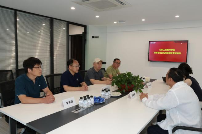 董占军一行首先实地走访参观了公司人事部、设计部、销售部等部门以及车间。参观完毕,校企双方进行座谈,并播放了双方的宣传片。座谈会由李希进主持。李希进介绍了“访企拓岗促就业”专项行动的重要意义及学院2023届各专业毕业生人数及就业情况,刘宁介绍了造型艺术学院的发展历程、学科设置、人才培养等情况。