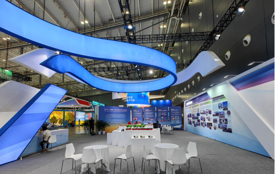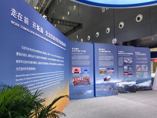山东主题展区设计整体以山东首字母“S”为基本元素,以领航巨轮为基本造型,以飘带概括链接,融汇齐鲁文化、海洋文化、丝路文化、泰山文化等概念,诠释了从蒙山沂水到黄河两岸,从泰山脚下到渤海之滨蕴含丰富文化性、地域性、科技性的齐鲁大地。展厅以展板+展品的形式呈现,展板视觉设计方面以线条描绘的代表性非洲动植物为基本元素,象征着中非的友好贸易关系。展板整体色彩上由蓝黄绿渐变组成,体现了“黄河入海”的特殊文化内涵。同时也将山东对外开放多元共融的发展理念,与博大的黄河文化、厚重的齐鲁文化相融合,象征着中非友好合作与时俱进。序厅以“走在前 开新局 全力打造对外开放新高地”为主题,以“牢记嘱托矢志不渝扩大开放”“踔厉奋进全力服务国家大局”“交流促进高能级开放平台接连落地”“务实合作开放型经济成果非凡”四个板块讲述山东在牢记总书记嘱托,主动服务国家开放大局,奋力打造对外开放新高地的奋斗形象,以“好客山东”的至诚姿态迎接着八方来宾。