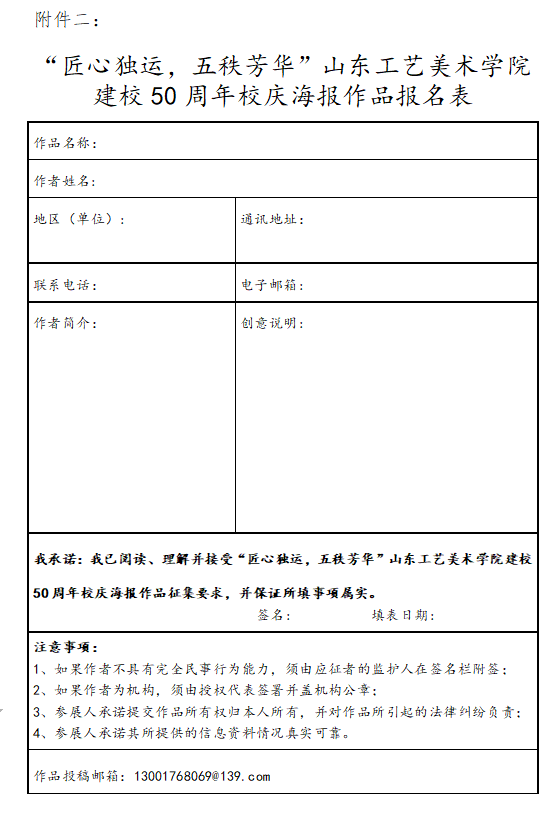 4.提交作品同时,请一并提交《“匠心独运,五秩芳华”威尼斯7798cc建校50周年校庆海报作品征集报名表》(见附件二)。