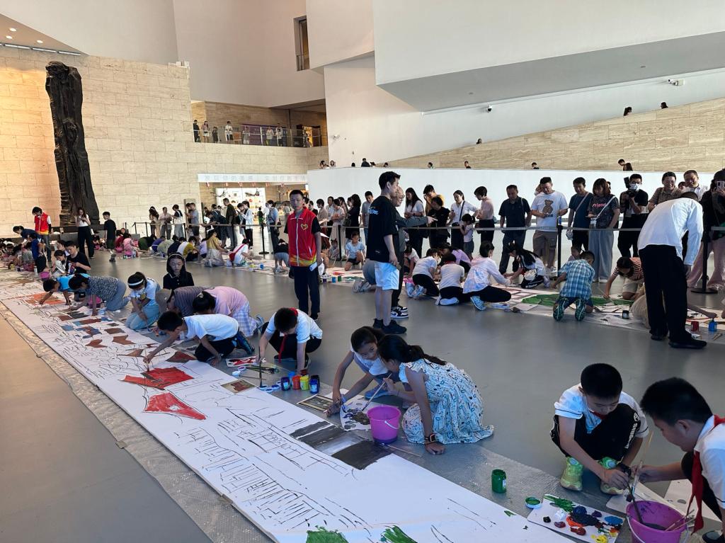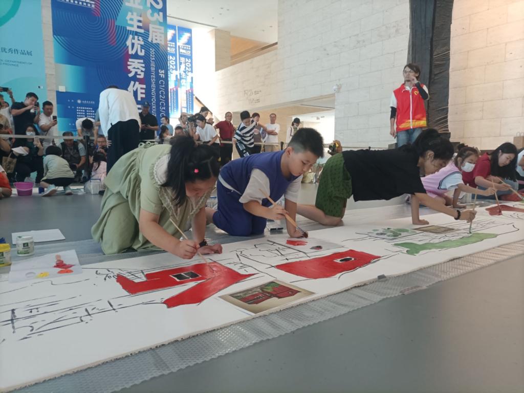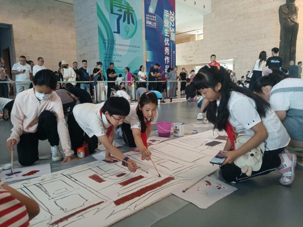 青少年是最富想象力和创造力的群体,在潘鲁生教授历次展览中,总有少年们的身影,他们或观察临摹,或参与传统工艺的动手实践,增添了展览的生机与创意。展览现场,孩子们面对一幅幅作品,兴奋地谈着自己对大湾区的印象,“海连着天,一望无边,满眼都是蔚蓝色”“高高的楼上闪闪的灯,大大的货船排着队驶进港湾”“多彩的霓虹灯把天空都照得五彩斑斓”“整齐的锅耳墙,成片的油菜花”……孩子们的感受千奇百怪但无一重复,正如青春从来不被定义般,他们对艺术家作品的描述简单却富有想象,不同的区域、建筑、场景在他们的联想中融为一体,正是带着这种对于未知的期待与想象,才能描绘和创造出充满希望的大湾区蓝图,就像孩子们的未来一样,充满活力和希望。