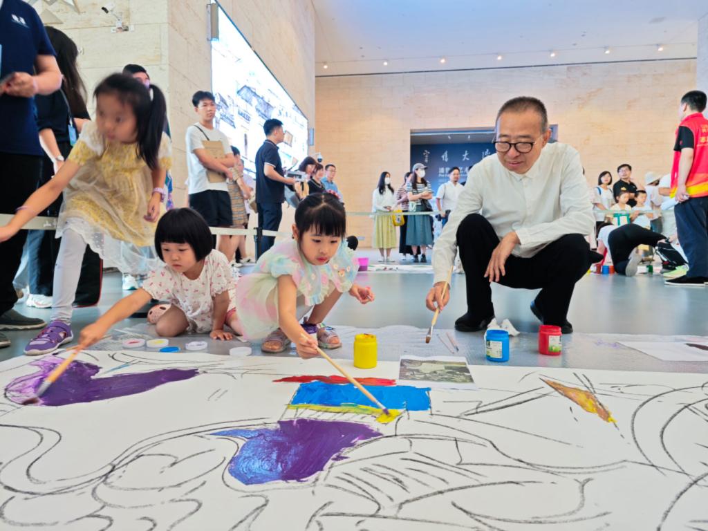 潘鲁生教授亲临现场指导孩子们用手里的画笔记录和表现事物,锻炼他们观察世界和表现自我的能力,鼓励他们在感受彩墨力量、创造美的同时,以艺术的方式表达情感。通过近距离的接触与互动,艺术家寄情大湾区的心愿,在孩子们的画卷里也得到了映现。潘鲁生教授说:“我童年时期最喜欢做的事情就是临摹新年画,那是学画的起点,也是艺术的启蒙。”展览上的临摹活动既是艺术体验,更是希望与传承。艺术家以最熟悉的艺术手法表现大湾区的传统建筑、安静的码头、斑斓的灯牌、整齐的村落,让我们看到了属于大湾区独特的景象。这些作品体现了艺术家的审美趣味和品味格调,传统的彩墨语言与现代化题材相融合,天际与海面在水墨氤氲间交汇,彩墨调和,宁静中充满力量,简洁中富有神韵,明亮而不张扬,乡土的情怀与民艺的热爱都融于其中。