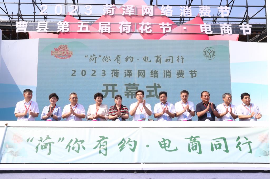 启动仪式上,王磊宣布2023菏泽网络消费节、曹县第五届荷花节·电商节开幕。王磊、孙敢敏、张艳霞、王磊、张鹏、肖云、黄济民、王东、蔡维超、尹慧萍、赵福龙、孟令选等省市县领导共同上台按下启动按钮,正式启动2023菏泽网络消费节。