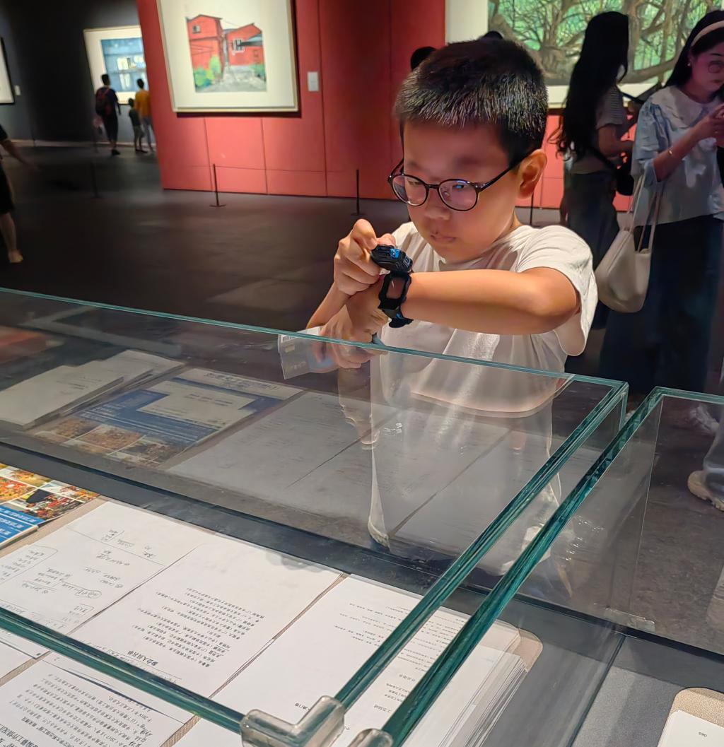 认真地用电话手表拍下自己喜欢的画作