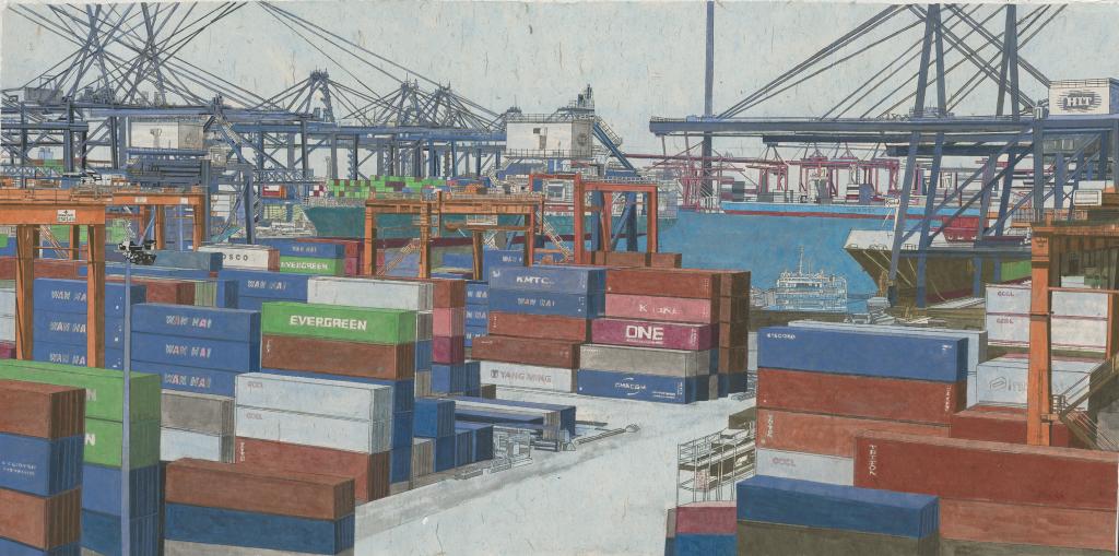 《港·葵涌码头》2022年124x245cm纸本·彩墨 潘鲁生
