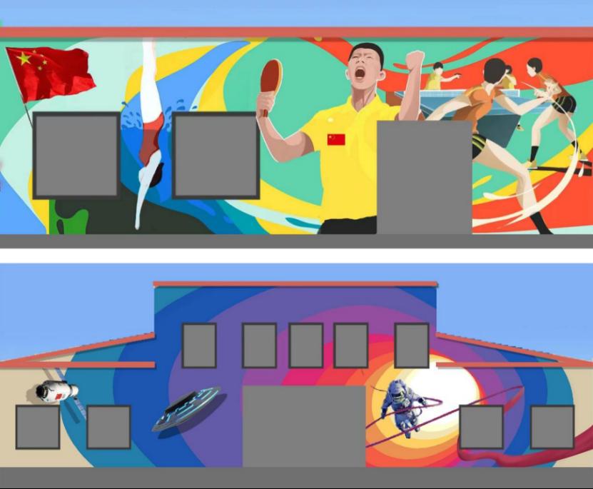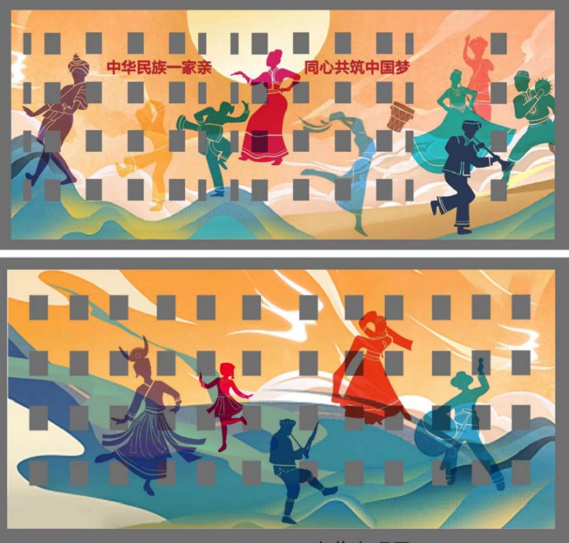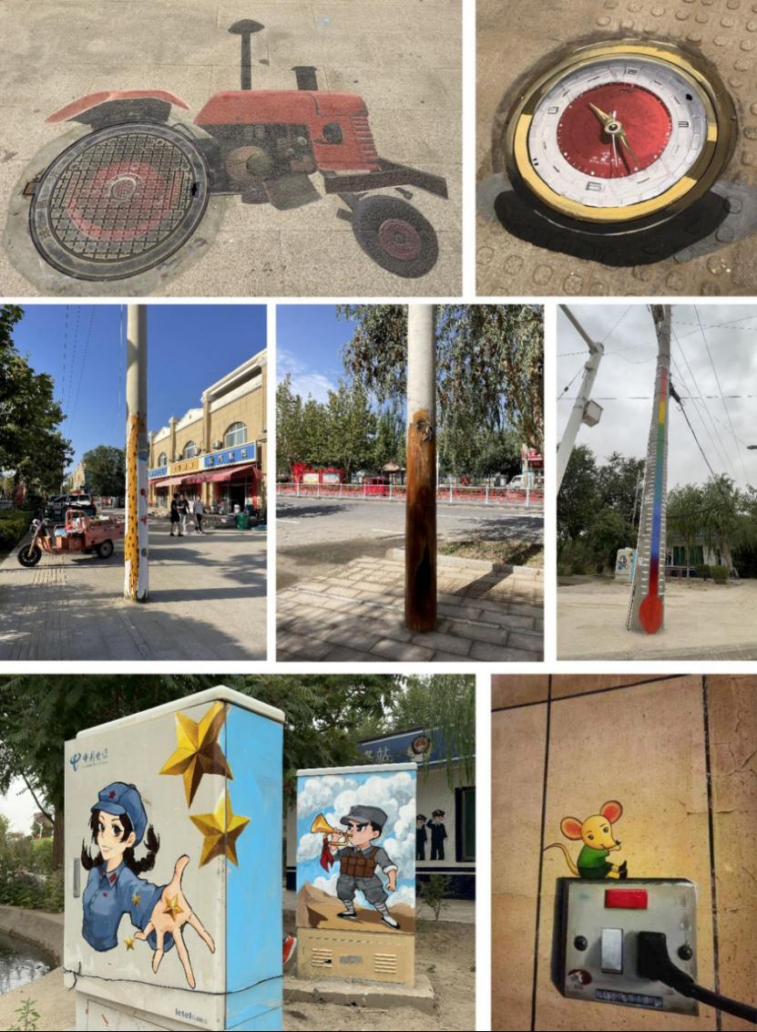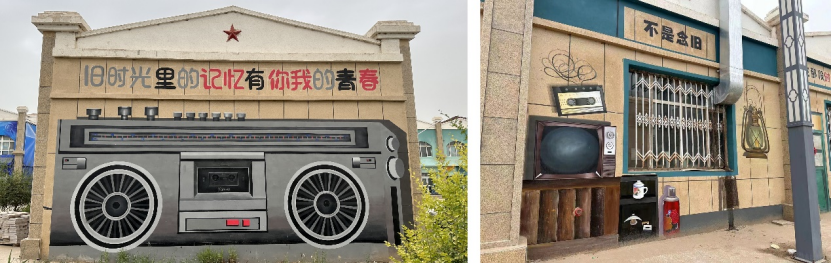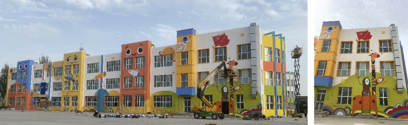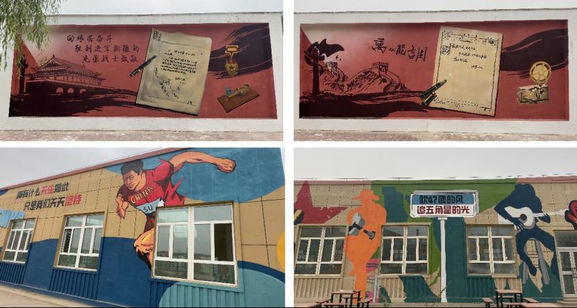 本次活动的壁画绘制是面向整个四十七团团场,主要覆盖在沿街的主干道与重要节点上,涉及建筑类型众多,依据其使用功能、面积、位置,服务队做了详细精确的设计,制定出了一系列方案。