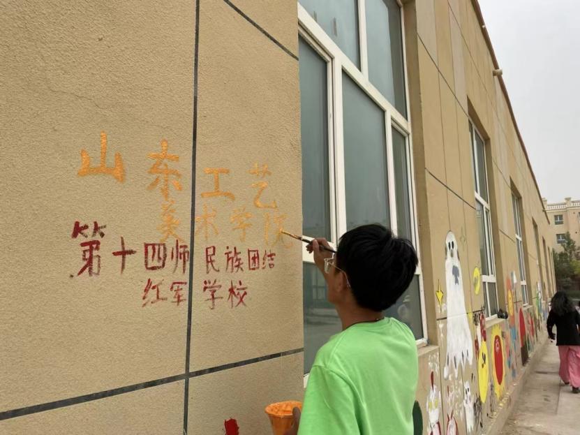 绘制期间,服务队联合第十四师民族团结红军学校开展“童心向未来 丹青颂华章”主题壁画参观实践活动。齐敬峰带领小朋友们参观了服务队的工作成果,并引导其亲身体验作画过程。服务队的“青春记忆”、“海洋馆”、“美好生活”等主题墙绘,涵盖了老兵精神、航天工程、体育音乐等丰富内容,使墙壁成为切实有效的社会课堂,成功地为小朋友们上了一堂别开生面的实践课。