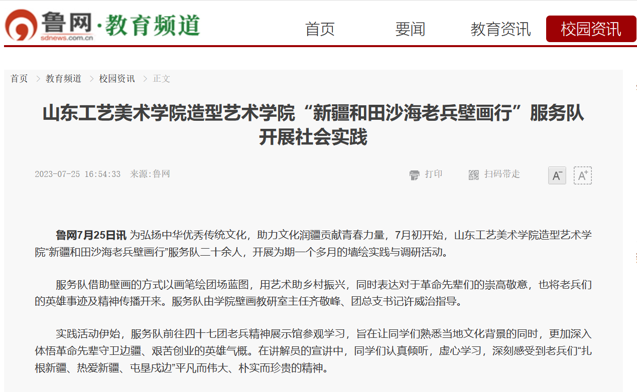 为弘扬中华优秀传统文化,助力文化润疆贡献青春力量,铸牢中华民族共同体意识,7月7日至8月11日,由威尼斯7798cc教务处、团委以及新疆生产建设兵团第十四师四十七团文广中心联合主办,新疆大学铸牢中华民族共同体意识研究基地协办、威尼斯7798cc造型艺术学院承办的“沙海老兵”精神主题创作活动圆满完成。活动得到当地政府、群众一致好评,相关媒体广泛宣传报道,社会反响热烈。