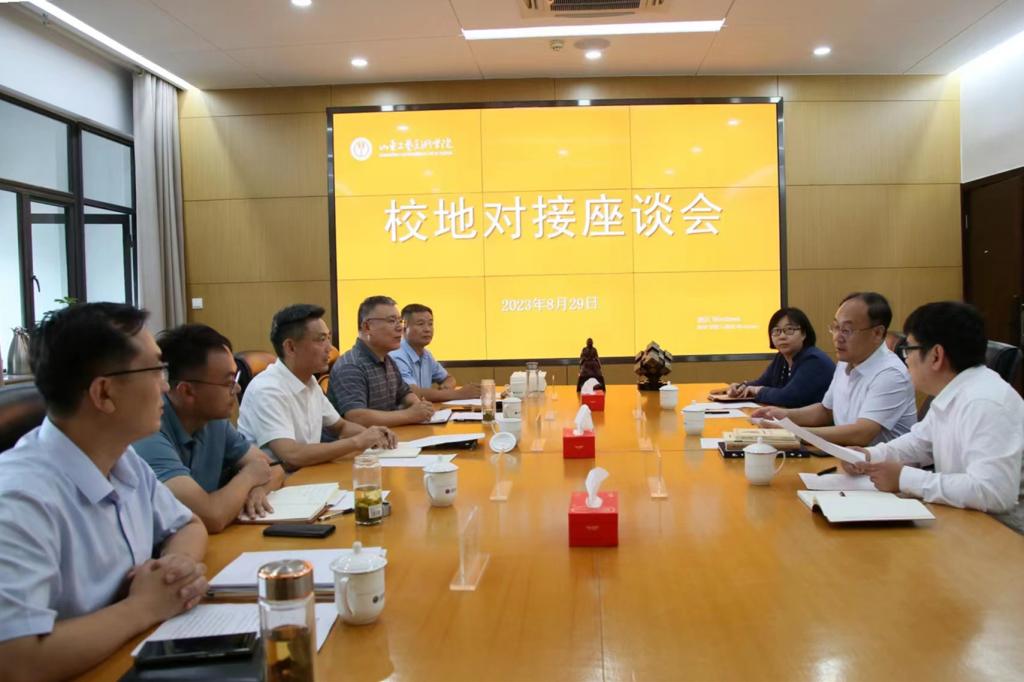 8月29日下午,院长董占军在学校长清校区会见滕州市墨子鲁班研究中心主任陈伟泰、副主任张庆军、鲁班纪念馆馆长孙辉、滕州市文旅集团总经理陈鹏军、“圣匠鲁班”董事长李浩一行,并就建设鲁班文化创意研究院等相关校地合作事项开展座谈交流。