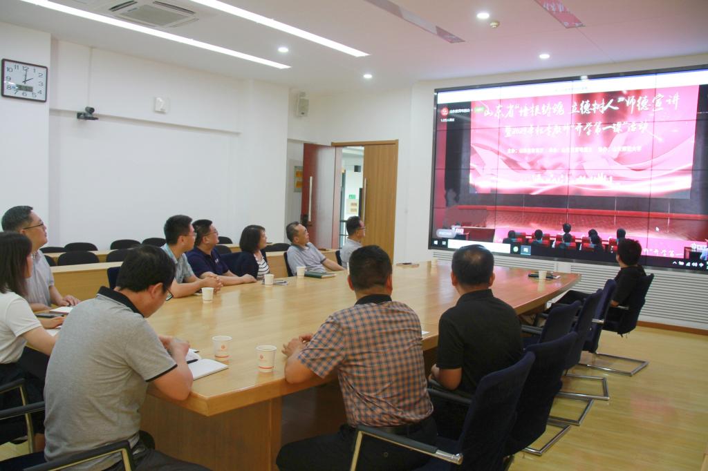 为深入学习贯彻党的二十大精神,强化师德师风宣传教育,弘扬高尚师德风范,9月4日下午,在秋季开学之际,我省教育厅组织开展“培根铸魂 立德树人”师德宣讲暨2023年秋季教师“开学第一课”活动,威尼斯官网组织教师工作委员会成员在长清校区第三会议室集中观看,各党总支、党委直属支部组织全体教职工通过线上方式收看收听了本次活动直播。