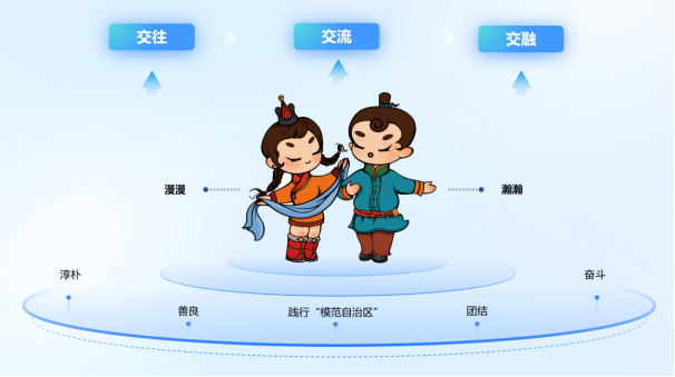 “漫瀚准优”IP形象,以准格尔旗国家级非物质文化遗产“漫瀚调”中男女对唱的形式为灵感,其中,穿着蒙古族特色形象服饰的女孩和男孩,彰显地域文化特征和民族特征。以“漫漫”和“瀚瀚”命名,既体现出IP形象来源于“漫瀚调”,又突显出“漫瀚准优”的品牌名称。品牌标志与IP形象相辅相成,共同塑造准格尔旗电商区域公用品牌。