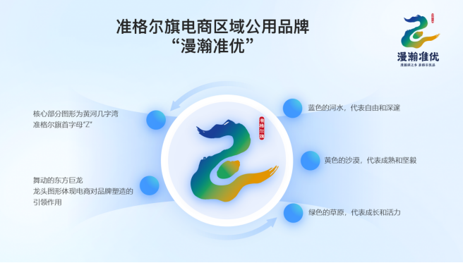 标志核心部分图形由黄河几字湾、准格尔旗首字母“Z”、高原、长城等图形元素构成,突显准格尔旗地域特征。同时,巨龙图形的呈现,传递出准格尔旗在电商领域的蓬勃发展。该标志整体造型融入丰富地域特征内涵,视觉效果灵动飘逸。