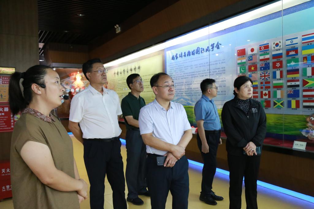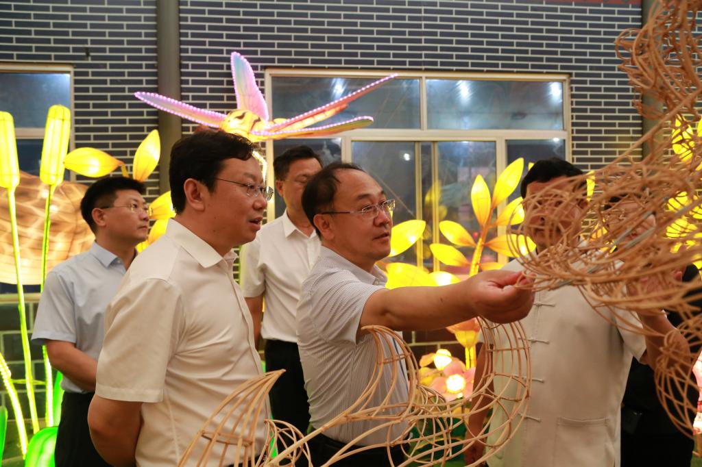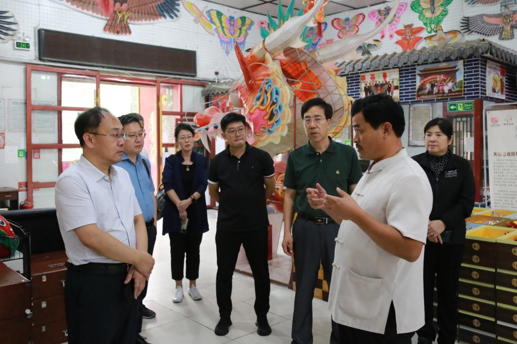 下午,董占军一行在潍坊市副市长狄波、潍坊市文化和旅游局党组书记、局长,市新闻出版广电局局长,市文物局局长权文松,潍坊市产教融合研究院副院长邵长山陪同下,实地考察了杨家埠民间艺术大观园,调研潍坊非物质文化遗产保护、文旅产业发展、设计创新和成果转化情况。