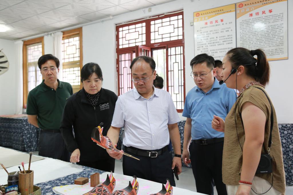 在潍坊天成飞鸢风筝有限公司,董占军一行实地察看企业产品设计、生产销售与设计创新情况,了解企业在工艺流程、技艺传承、设计创新、设计成果转化应用等方面的情况。在杨家埠风筝博物馆,董占军听取工作人员关于潍坊风筝起源、艺术特色、扎制工艺、潍坊国际风筝会举办等情况的汇报。在年画博物馆,董占军与年画雕版工艺美术大师进行交流,了解潍坊年画起源、历史成就、雕版制作工艺、手工艺人经济收入等。