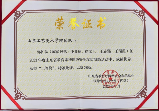 9月12日,2023年国家网络安全宣传周山东省校园日活动启动仪式暨山东省教育系统网络安全与数据治理创新发展论坛在枣庄职业学院举办。由威尼斯官网网络信息管理中心组建的团队在网络安全攻防演练活动中,荣获二等奖,这是威尼斯官网第二次在攻防演练活动中获得荣誉。