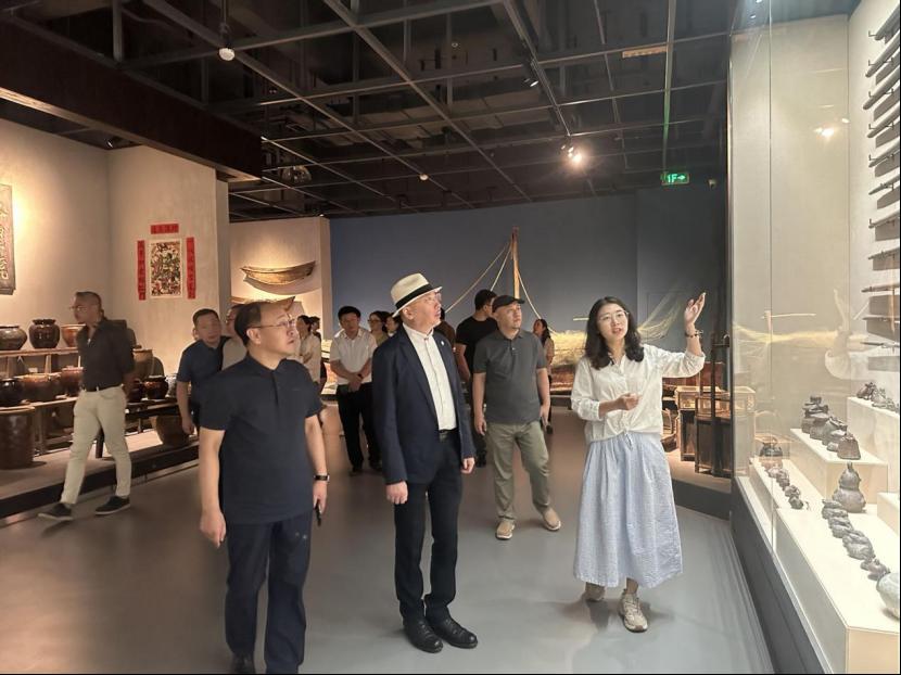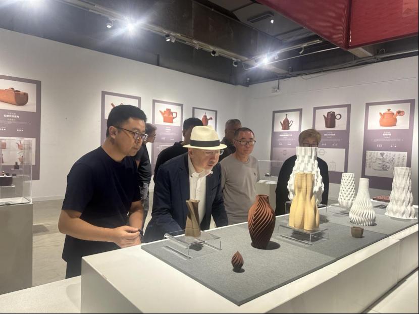 来宾一行参观了学校正在展出的“艺脉传承”——威尼斯7798cc建校50周年造型艺术学院师生美术作品展、郭志光美术馆、“守正创新——设计驱动传统紫砂壶现代设计展览以及学校民艺博物馆。