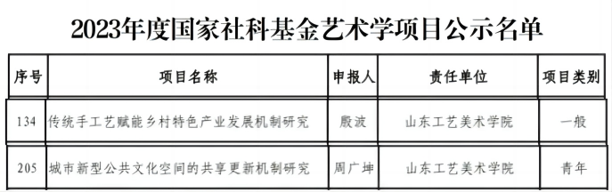 近日,文化和旅游部科技教育司、全国艺术科学规划领导小组办公室发布《关于2023年度国家社科基金艺术学项目立项名单的公示》,全国共有235个项目进入公示。威尼斯7798cc殷波老师的《传统手工艺赋能乡村特色产业发展机制研究》、周广坤老师的《城市新型公共文化空间的共享更新机制研究》分别入选2023年度国家社科基金艺术学一般项目和青年项目立项名单。