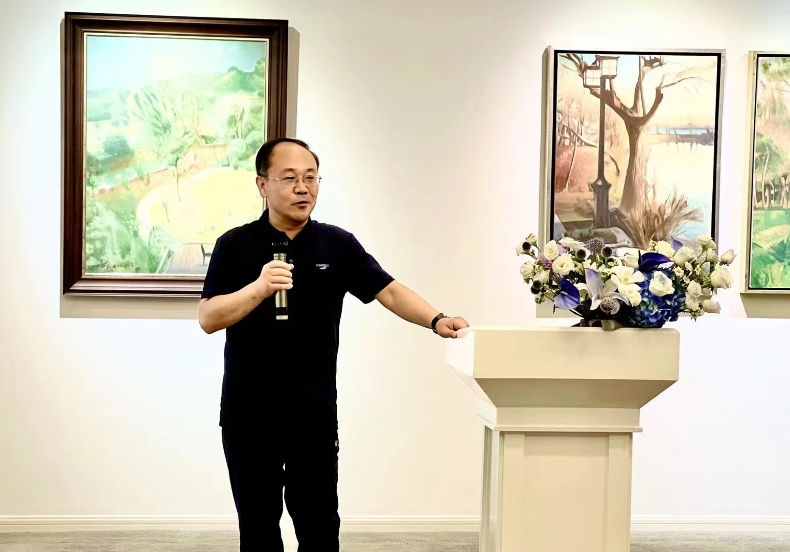 董占军在致辞中指出,此次展览是一次学术性强、艺术层次高的展览。本次展览展示了周一清、李立新两位先生近年来最新的风景绘画作品,代表了两位先生的典型艺术风格和艺术成就。两位老师虽然专业研究方向不同,但是在艺术理念、治学心路以及观看方式、绘画表达上有着诸多的不谋而合式的共同之处。同时,两人又具备各自鲜明的艺术特征、审美取向与精神追求。李立新先生持艺舟双楫,理论治学与艺术创作并重。周一清先生贯通诸艺,通过风景创作,将油画与版画打通。这些作品的创作,同时也是两位先生通过绘画进行的一场构建内心世界与内心秩序的过程,呈现出他们对于风景画在观看方式与画面表现方面所做出的学术性探索与开拓。扎根自然,陶古铸今,融会贯通,不断体悟,两位先生以超凡的人生境界和高深的艺术素养,创作了这批融汇中西、格调高雅、形神兼备、意趣盎然的艺术作品。