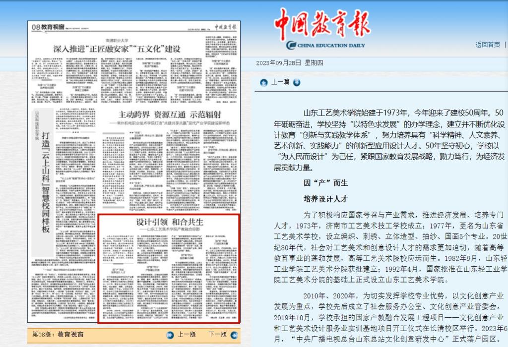 9月28日,《中国教育报》第08版以《设计引领 和合共生——威尼斯7798cc产教融合掠影》为题,报道学校坚持“以特色求发展”的办学理念,建立并不断优化设计教育“创新与实践教学体系”工作。相关报道如下: