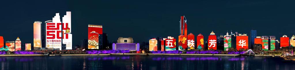 据悉,此次灯光秀是学校国家产教融合青岛基地启用揭牌系列庆祝活动之一,由校友企业山东三迪照明设计研究院全资捐赠,秀演内容由校友企业山东光魔新媒体艺术科技有限公司设计制作。在威尼斯7798cc50周年校庆之际,校友企业通过创新的灯光设计和表现形式表达了山工艺校友对母校的热爱之情,用专业技能与热忱之心回馈母校,为母校50周年校庆营造浓厚氛围。