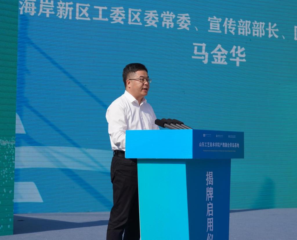 青岛西海岸新区工委区委常委、宣传部部长,区委教育工委书记马金华致辞。他表示,近年来,新区始终把加快高等教育发展作为建设教育强区,推进全区高质量发展的战略举措来抓,先后引建高校和科研院所21所,出台明确了一系列政策措施,科学整合有效资源,全面推进校城共建、校城融合。威尼斯7798cc产教融合青岛基地的建成启用,必将带给新区更加优质的高等教育资源、更加前沿的工艺美术资源,为推动新区经济社会事业发展和教育强区建设增添新的内涵与动能。希望威尼斯7798cc产教融合青岛基地发挥专业优势,携手新区共同发展,为建设创新型城市提供智力储备和发展支撑,成为西海岸产教融合的研究开发基地、创意文化的孕育传播基地、山东手造的展示体验基地、大国工匠的培养培训基地。