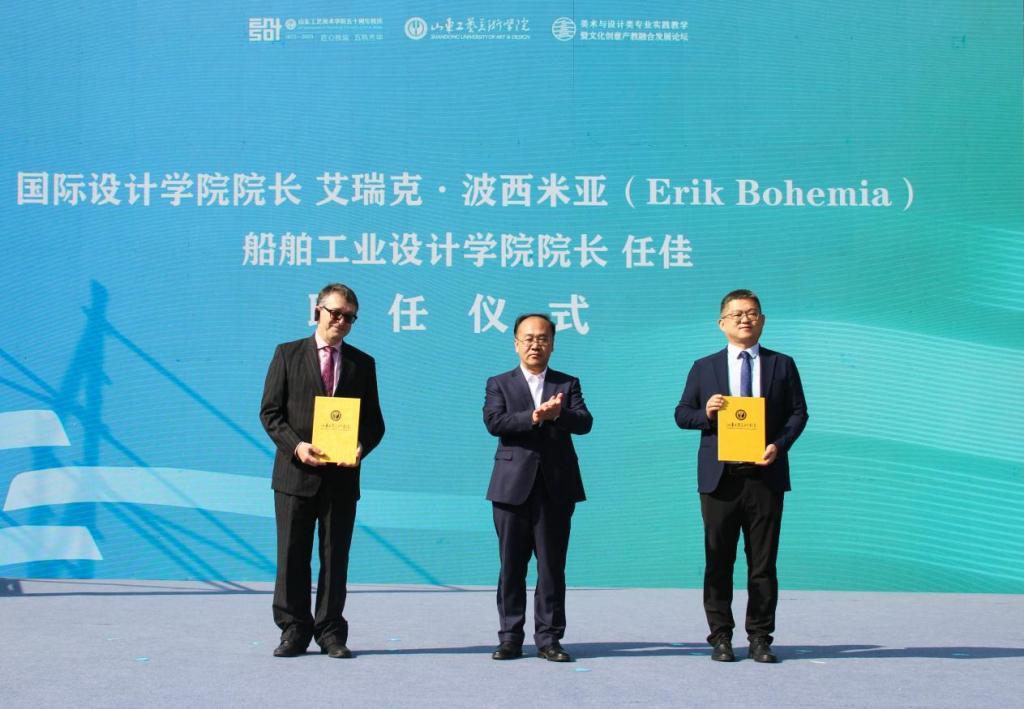 董占军为艾瑞克·波西米亚、任佳颁发国际设计学院、船舶工业设计学院外聘院长证书。