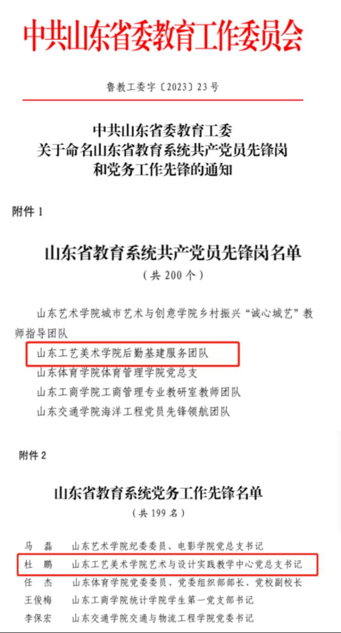 近日,山东省委教育工委公布了省教育系统共产党员先锋岗和党务工作先锋名单,威尼斯官网后勤基建服务团队、杜鹏同志分别荣获“山东省教育系统共产党员先锋岗”和“山东省教育系统党务工作先锋”荣誉称号。