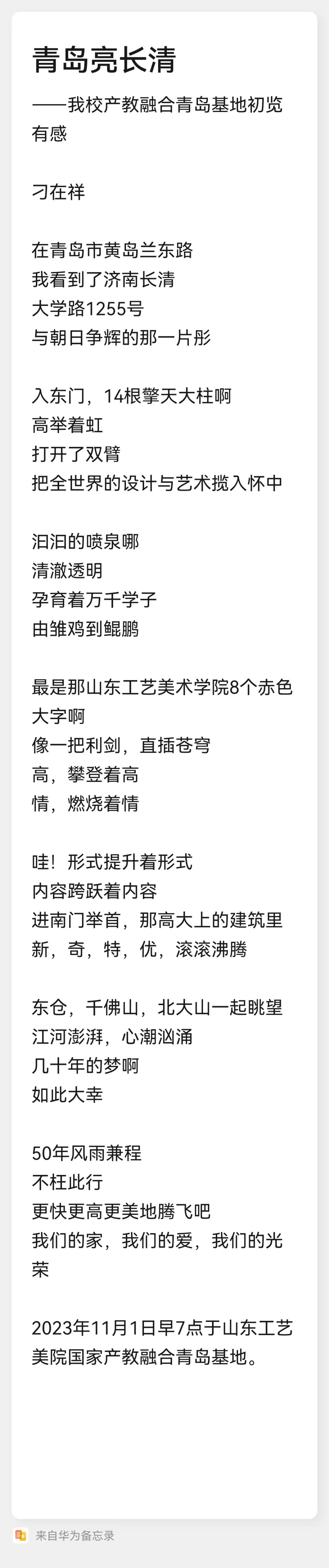 老同志们对产教融合青岛基地的建设发展心生感慨,对学校的快速发展感到自豪。学校原副院长刁在祥在参观校园后,现场赋诗《青岛亮长清》(附后),表达了对学校及青岛基地建设发展的赞美赞叹。老同志们也提出一些宝贵建议,希望学校办学优势与基地的区位、资源优势充分结合起来,不断提升人才培养质量,充分发挥大学服务社会的职能,更好助力青岛和西海岸新区发展。
