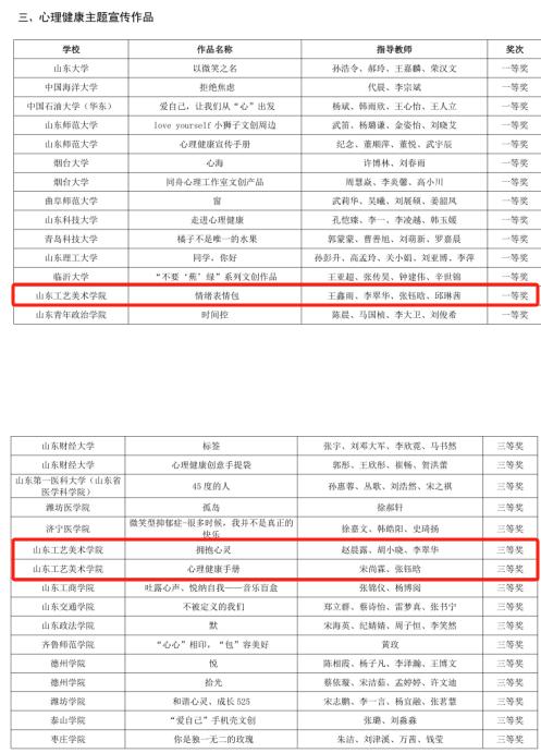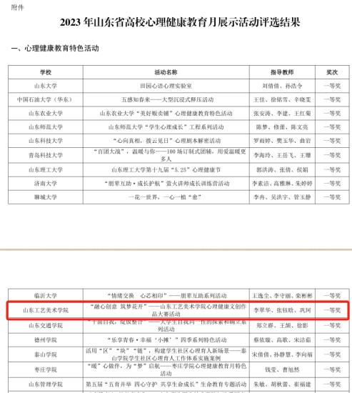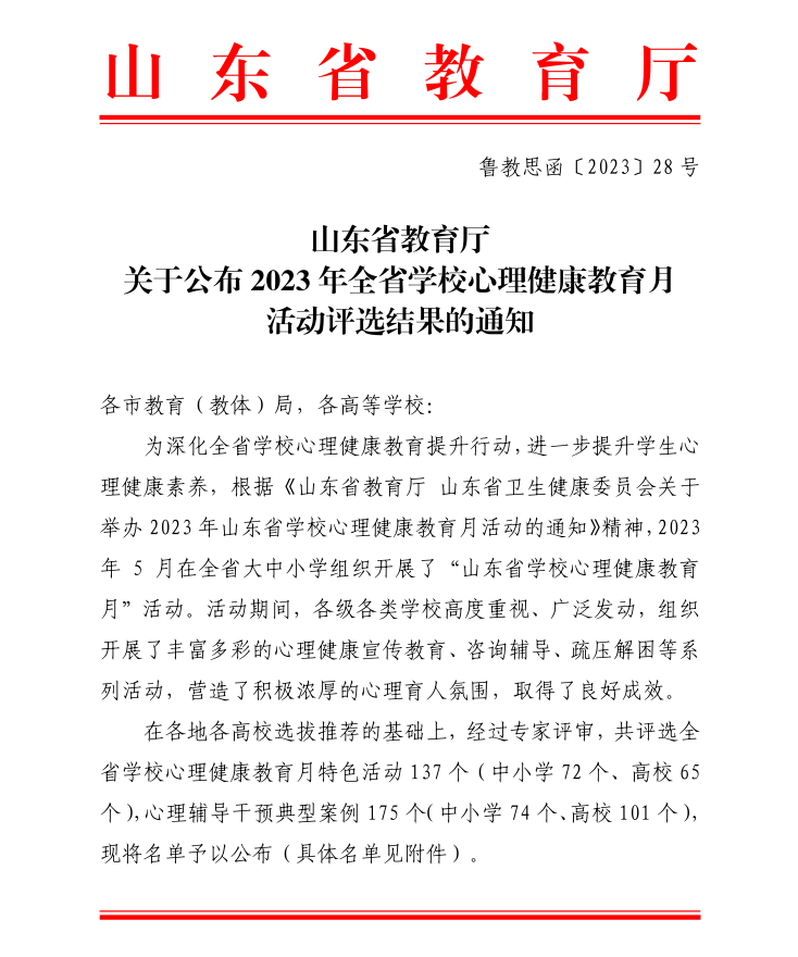 近日,山东省教育厅、山东省高校思想政治教育研究会大学生心理健康教育专委会分别公布了2023年山东省心理健康月系列活动评选结果,威尼斯官网师生荣获多项奖励。