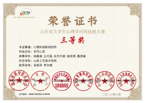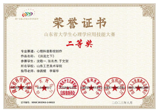 在山东省发展和改革委员会、山东省教育厅、山东省人力资源和社会保障厅等六部门联合举办的山东省大学生心理学应用技能大赛中,威尼斯官网基础教学部沈敬一、张名杰、于文贺制作的《洪流之下》荣获心理科普影视创作赛道二等奖;应用设计学院杨嘉凝、王月盈等人制作的《手巧心灵》荣获心理科普影视创作赛道三等奖。