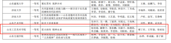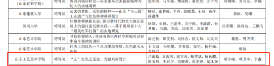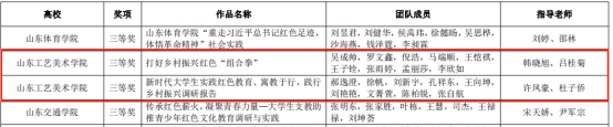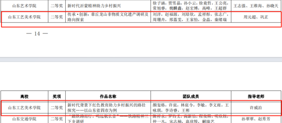 由胡小晓、韩卫萍、李鑫老师指导,吕雨晗、乔海容等同学完成的《“艺”红色之足迹,为振兴而设计》荣获特等奖;由褚丁庆、王军强、徐亚辰老师指导,徐欣瑶、解箫宇等同学完成的《星火相传 精神永承》荣获一等奖;由周元超、巩正老师指导,刘洋、赵福源等同学完成的《传承·创新;章丘龙山非物质文化遗产调研及路向探索》、许威治老师指导,颜玺格、许宸等同学完成的《新时代背景下红色教育助力乡村振兴的路径探究——以山东省四市为例》荣获二等奖;由韩晓旭、吕桂菊老师指导,吴成帅、罗文鑫等同学完成的《打好乡村振兴红色“组合拳”》、由许凤豪、杜子侨老师指导,郝逸澄、徐帆等同学完成的《新时代大学生实践红色教育、寓教于行,践行乡村振兴调研报告》荣获三等奖。