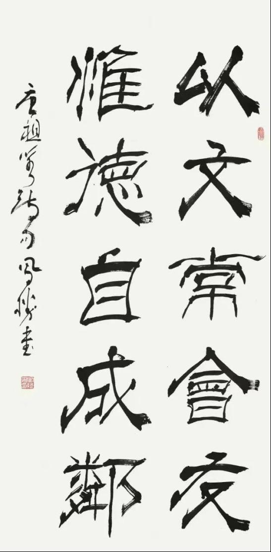 本次展览遴选了王凤胜创作的书法作品90余件,以隶书、草书为主。作品临创结合,既有尺牍小品,也有鸿篇巨制。其中,隶书宗法高古,结构布局章法严谨,骨力强健,宽厚质朴,率真自然;草书以明清祝允明、王铎、傅山等名家书艺为依托,回旋进退,枯笔连绵,潇洒飘逸,内蕴超然之气。欧阳中石先生称赞其书艺“真情如注”,蒋维崧先生曾亲笔为其批改书法练习册,称赞其书法“路子正,肯下功夫,有才华”。