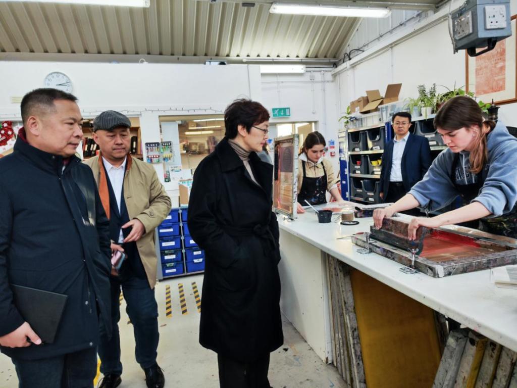 12月4日上午,代表团访问伯明翰城市大学艺术设计学院。该院是伯明翰城市大学五大学院之一,其艺术与设计专业位列2023QS世界大学专业排行榜第150位。访问期间,代表团考察了学院的教学设施并就实验室的运营和管理模式进行了调研;与院长Nathan Tormans、研究生课程主任Robert Gibb、中国视觉艺术研究中心主任Joshua Jiang座谈交流,就合作开展学生短期交流、1+1+1硕士双学位、教师访学和进修等项目达成合作意向,双方一致同意尽快推进签署合作备忘录。