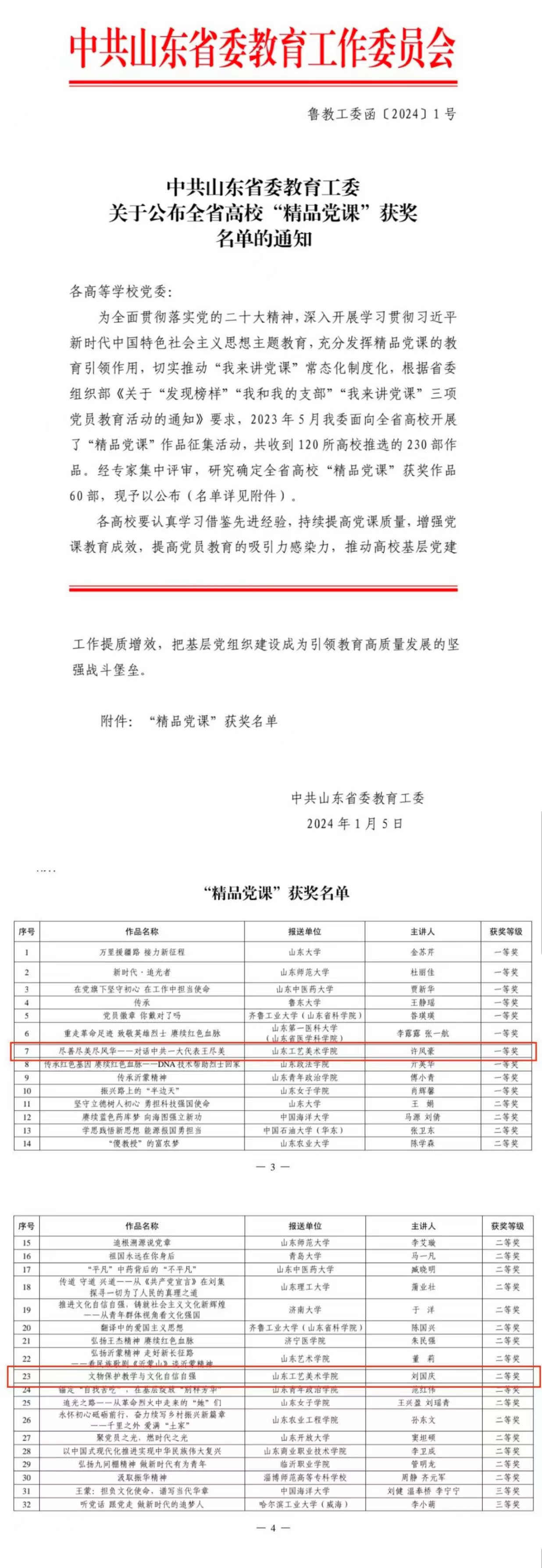 近日,山东省委教育工委公布了全省高校“精品党课”获奖名单,共评选出全省高校“精品党课”获奖作品60部,其中一等奖10部、二等奖20部、三等奖30部。威尼斯官网数字艺术与传媒学院党总支教工党员许凤豪主讲的《尽善尽美尽风华——对话中共一大代表王尽美》获评一等奖,人文艺术学院党总支教工党员刘国庆主讲的《文物保护教学与文化自信自强》获评二等奖。