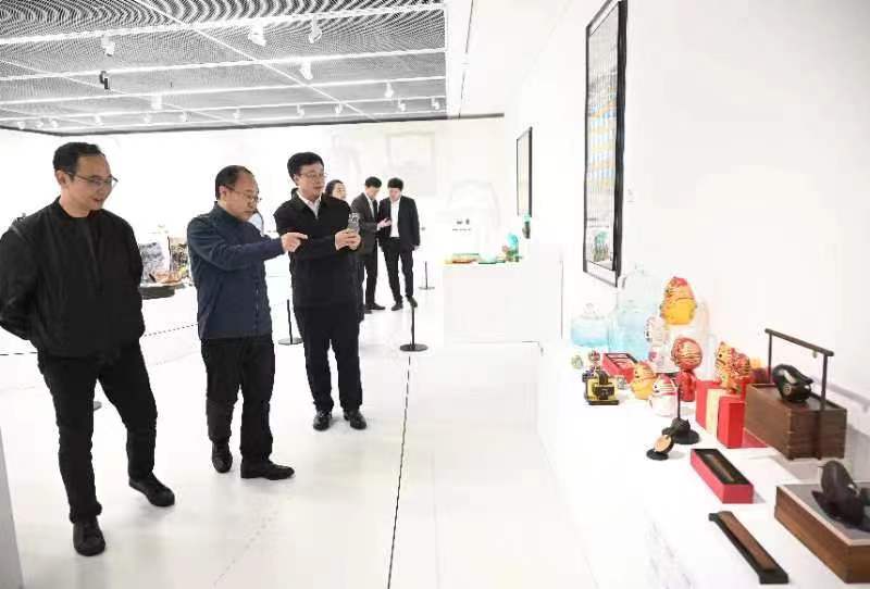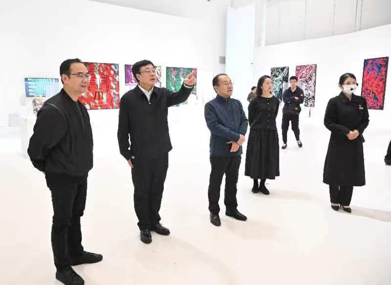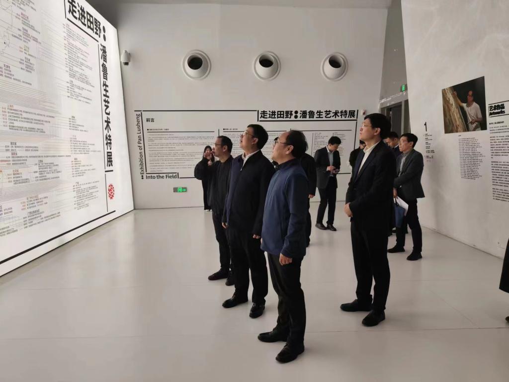 在深圳市当代艺术与城市规划馆,董占军向潍坊市领导详细介绍《走进田野——潘鲁生艺术特展》总体情况。展览主体涵盖艺术作品、田野文献、衍生设计三个主要展示单元,延续了潘鲁生教授“民间”“田野”与“艺术”“设计”创作主题,进一步充实了一批彩墨、纤维、综合材料新作以及诸多学术成果和历史文献。展出的艺术与设计作品取材于田野民艺,回归于生活日用,是中华优秀传统文化创造性转化与创新性发展的生动实践。董占军指出,《走进田野——潘鲁生艺术特展》作品丰富、文献充实、设计创新,凝结和展示出潘鲁生教授40年间行走田野、深入民间、调查研究、学术思考的心血智慧和研究成果,也体现出潘鲁生教授几十年间一以贯之、不断发展的艺术创新理念和设计艺术教育思想。