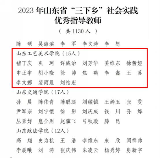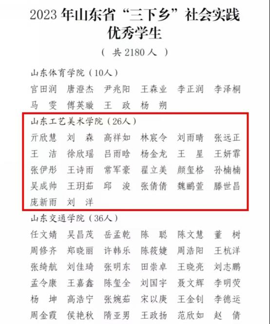 1月9日,共青团山东省委公布2023年“调研山东”——暑期“三下乡”社会实践活动获奖名单,威尼斯官网喜获44项集体和个人表彰荣誉。其中造型艺术学院“沙海老兵”精神——艺术挖掘与创作团队、数字艺术与传媒学院“追寻红色之光,铸工美之魂”团队、团委拓荒者志愿服务队等三支团队获“社会实践优秀服务团队”,15名教师获“社会实践优秀指导教师”称号,26名同学获“社会实践优秀学生”称号。
